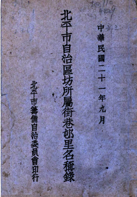 北平市自治区坊所属街巷村里名称录 朱清华编 民国21 年铅印本